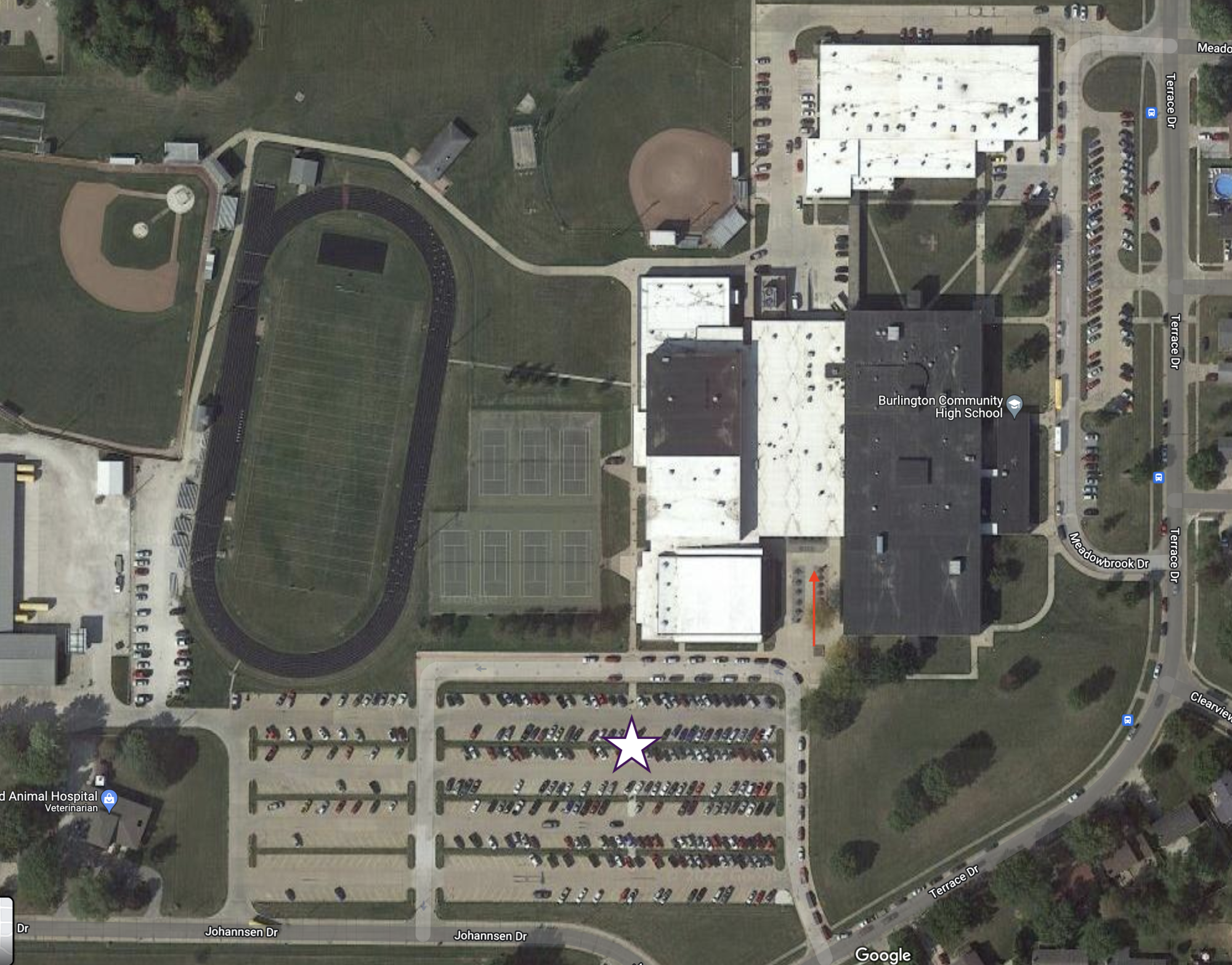 Attendees should park in the student/staff parking lot off of Terrace Drive to the South of the building marked with the star. The red arrow is the door we will have open and use as the main entrance.