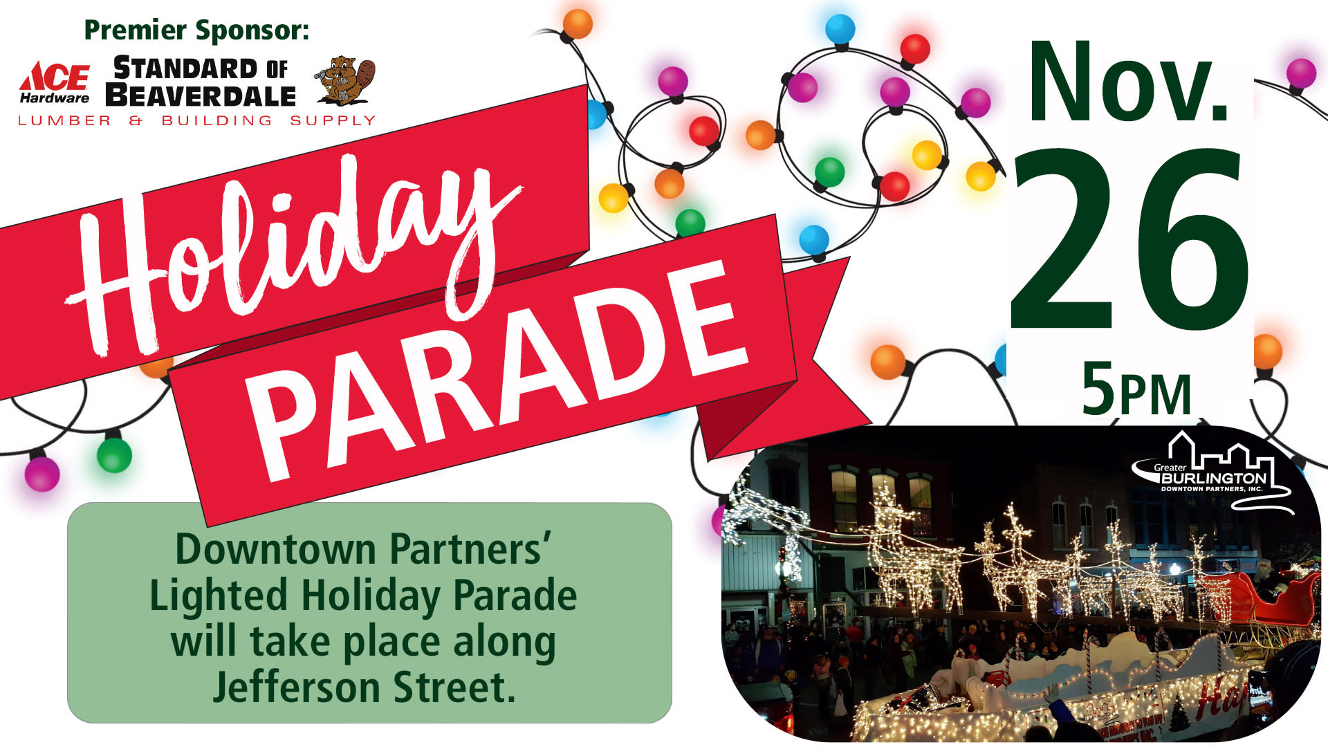 One of the region’s favorite events, the annual Lighted Holiday Parade will start at 5 PM Saturday, November 26, heading east down Jefferson Street toward the Burlington riverfront - where more festivities, including the annual Tree Lighting Ceremony, will take place!