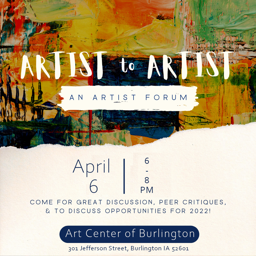 Originally conceived by Art Center Director Elizabeth Pappas, this monthly forum serves as a conduit between the two art centers - Fort Madison and Burlington - to better serve the region's artists.The Art Center of Burlington and the Fort Madison Area Arts Association will alternate hosting the group to give each group further reach. If you are an artist, please consider sharing your point of view - and a piece of your work for discussion & feedback - with the group.