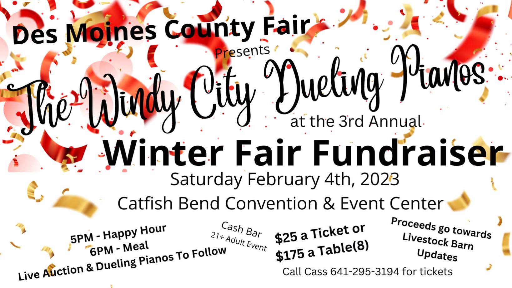 All are welcome to help support the Des Moines County Fair while enjoying a delicious meal and fun social hour, plus live auction, cash bar and dueling pianos.