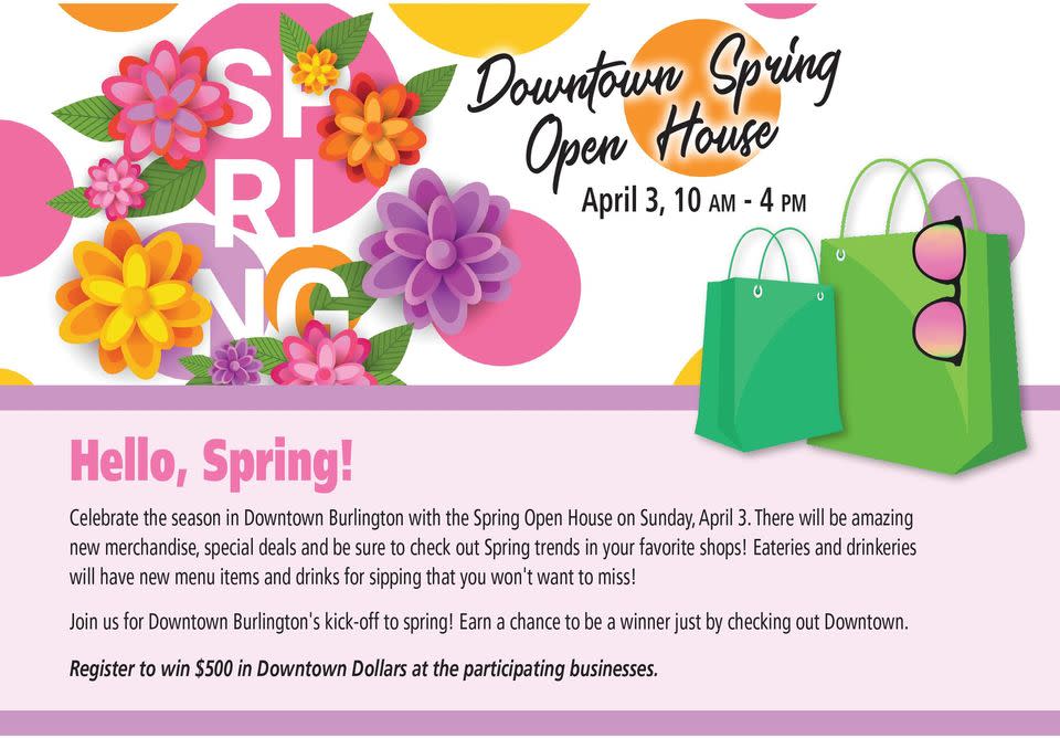 Celebrate the season in Downtown Burlington with the Spring Open House on Sunday, April 3. Check out amazing new merchandise, Spring trends, hot sales and special deals; new menus items at your favorite eateries and drinkeries - and don't forget to register for the $500 Downtown Dollars drawing!