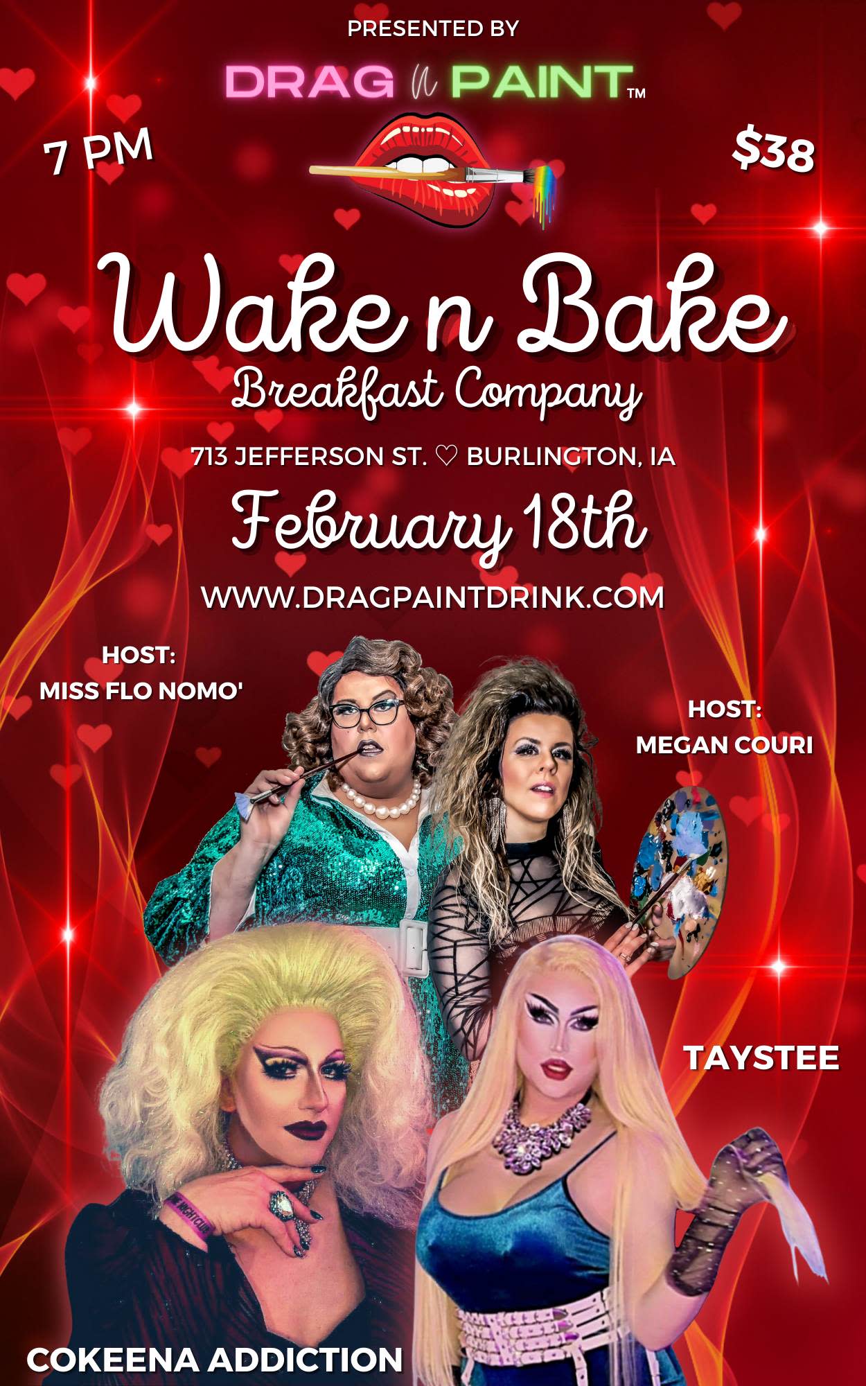 Create your own masterpiece with expert guidance from artist Megan Couri – and enjoy a fabulous drag show and a few beverages while you’re at it! This fun and popular event is the perfect girls’ night out and tickets will go fast. $40 each at Wake N Bake or online at Eventbrite.com.
