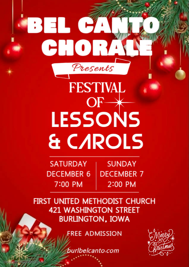 The Festival of Lessons and Carols is a festive concert of lessons & carols performed by Bel Canto Chorale, Shoquoquon Children's Choir, and the Southeast Iowa Brass Quintet.