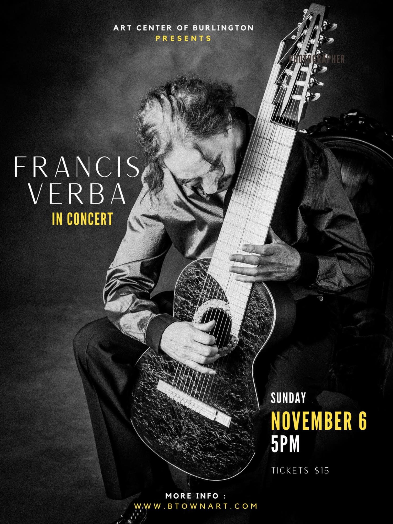 Accomplished classical guitarist Francis Verba returns to the Gallery Lounge at the Art Center of Burlington as he concludes his US tour. Tickets are $15 and available at the Art Center or at the door on the evening of the concert. Cash bar.