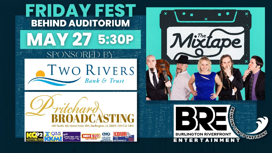 Burlington Riverfront Entertainment will host Friday Fest outside in the parking lot on the south side of Memorial Auditorium. Friday Fest is free and open to the public - thanks to generous sponsors Two Rivers Bank & Trust and Pritchard Broadcasting.