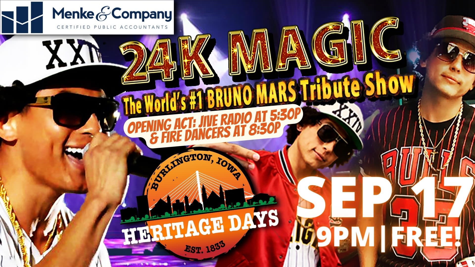 Heritage Days wraps up with jive, fire and funk! Local favorites Jive Radio take the outdoor stage behind Memorial Auditorium at 5:30 PM, followed by a dazzling fire show with fire dancers and jugglers, and at 9 PM the world’s #1 Bruno Mars tribute show, 24K Magic, brings uptown funk to downtown Burlington!