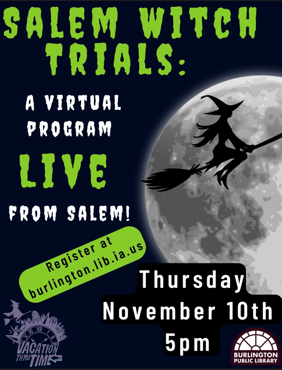 The Salem Witch Museum presents this exclusive live stream at Burlington Public Library. The Salem Witch Trials immerses participants in the culture and history of 1692 Salem, Massachusetts and this unique and impactful event in American history.
