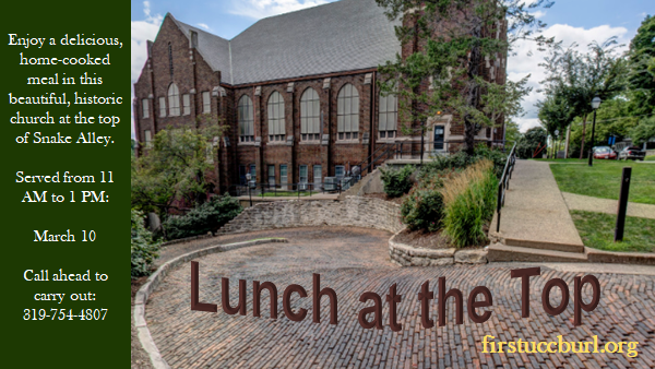 Warm up for St. Patrick's Day with homemade reuben casserole or a beef-rite sandwich, plus two sides, dessert and a beverage, all for just $7. Call ahead to carry out, or dine in the warm and friendly social hall in this beautiful historic church at the top of Snake Alley. Call 319-754-4807 for to go orders.