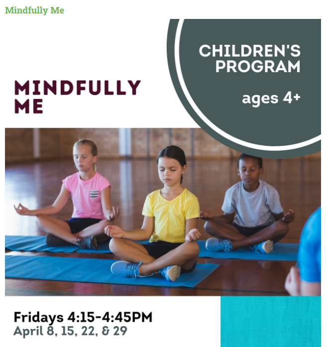 This fun drop-in program for kids age 4 and up is open to all with no registration required. Mindfully Me is a half hour of fun beginner yoga poses, breathing practices and calming strategies, plus a literary element.