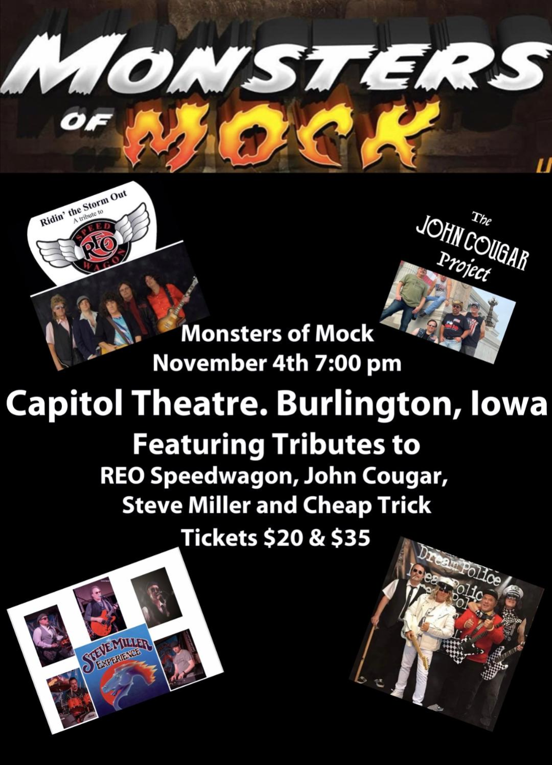 Relive the glory days with the music that once poured from your dashboard tape player. Monsters of Mock brings four iconic rock & roll bands to life with tributes to REO Speedwagon, John Cougar Mellencamp, the Steve Miller Band and Cheap Trick.