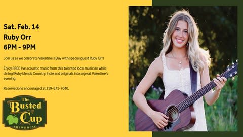 Talented local singer/songwriter/guitarist Ruby Orr returns to Busted Cup to serenade your Valentine’s Day dinner, drinks or dessert at Busted Cup. No cover – but reservations are encouraged tonight!
