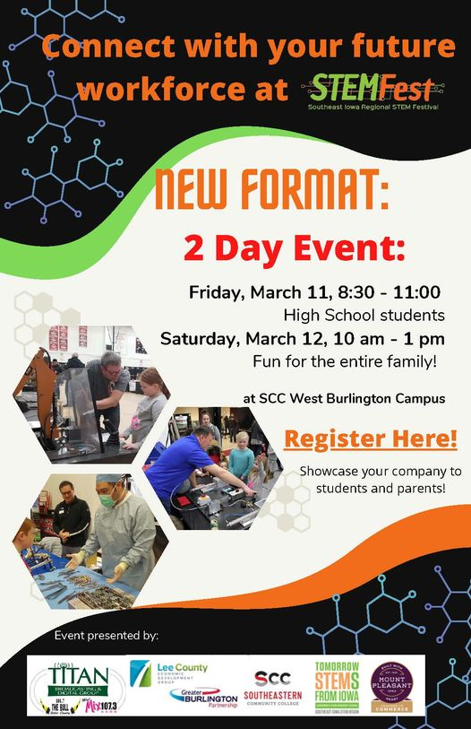 The Southeast IA STEM Festival is produced by the Governor's STEM Advisory Council in partnership with the Greater Burlington Partnership, Southeastern Community College, Lee County Economic Development, and local businesses and community leaders. Activities will be developed and presented by STEM experts from business, higher education, community organizations, and informal education venues.