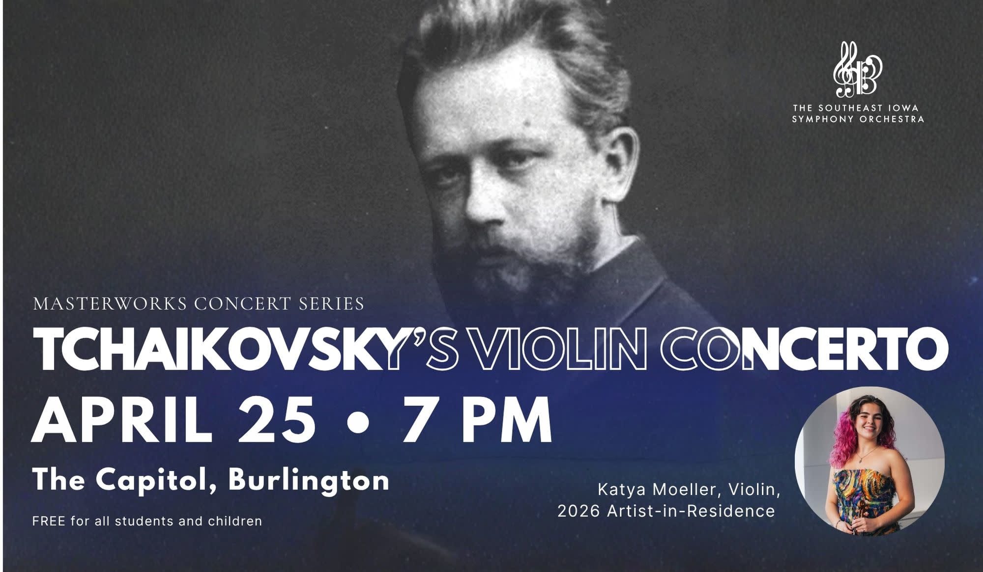 The final concert of Southeast Iowa Symphony Orchestra's 75th season Masterworks Series features the cascading sounds of Smetana’s beloved national masterpiece, a delightful 3-part Mexican folk music symphony, and the delicate, passionate, and dazzling dance of Tchaikovsky’s Violin Concerto, performed by returning Artist-In-Residence, Katya Moeller.