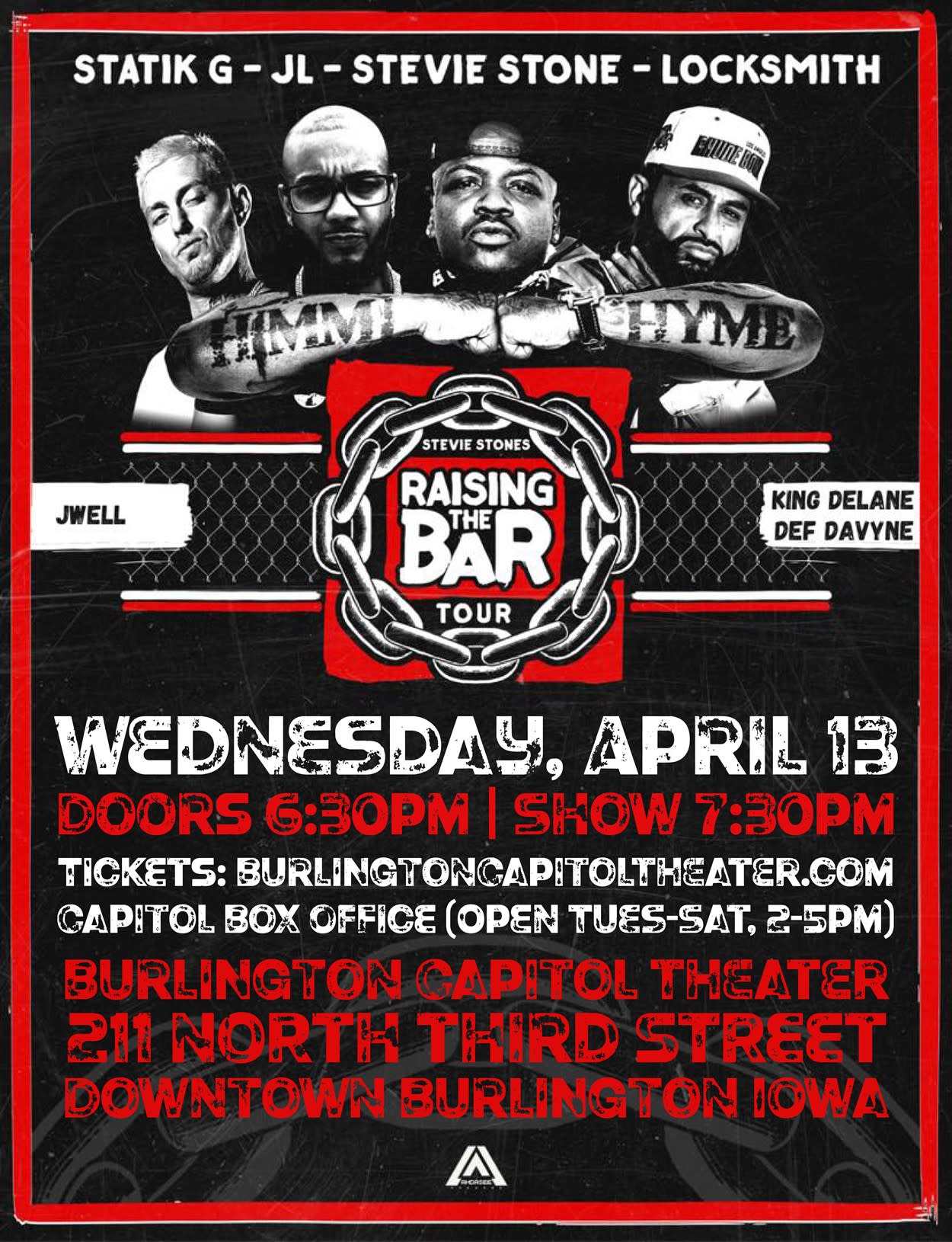 Grind Life Music Group, DJ Rude Boi and Phillip Stengel present the Raising the Bar Tour, featuring Stevie Stone, Locksmith, JL and Statik G. Tickets are $25 (priority seating $40) and available at the Capitol Theater Box Office or online.