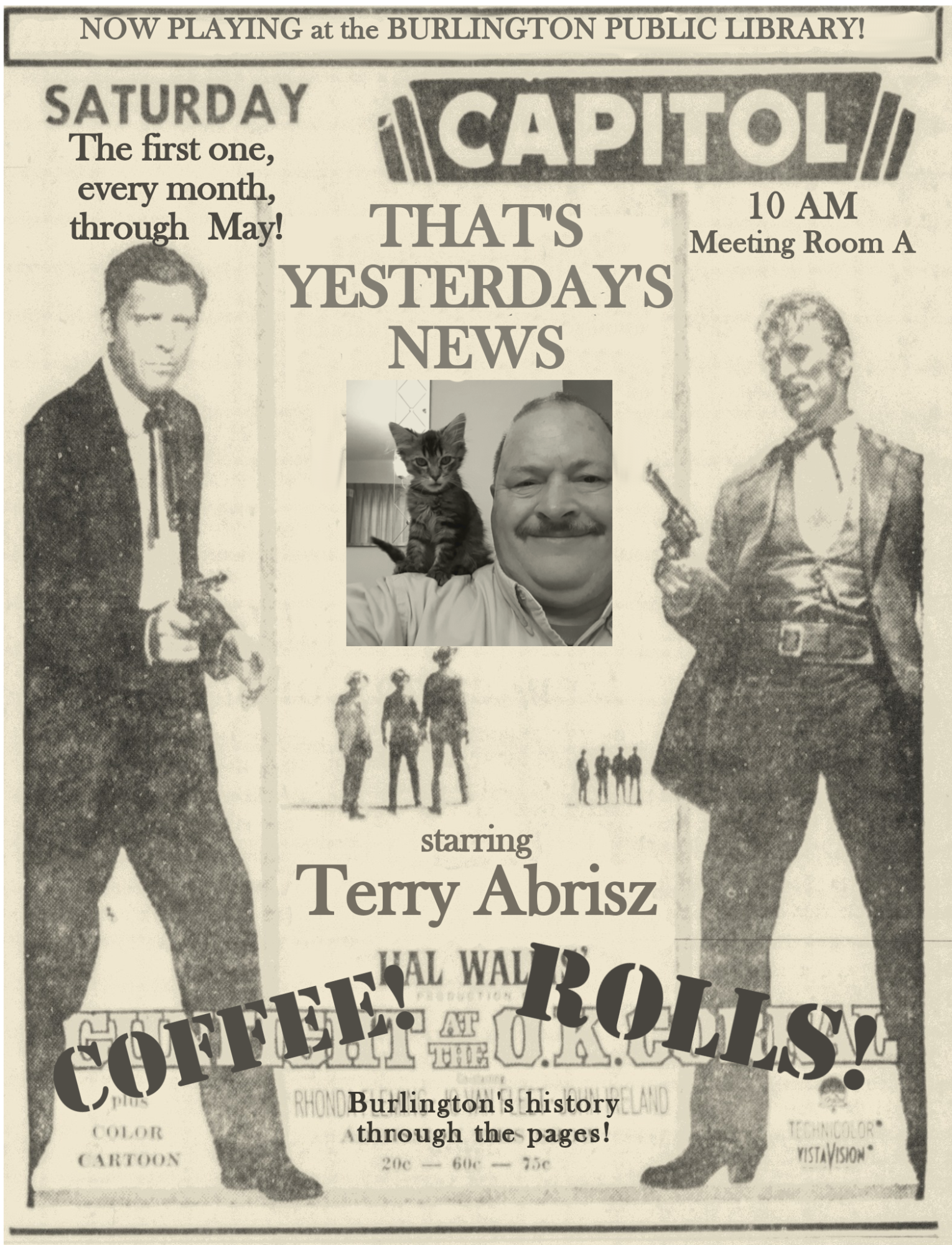Local historian Terry Abrisz offers a tour into Burlington’s past guided by newspaper headlines and advertisements of yesteryear. Light refreshments provided. This event is free and open to the public. For more information, visit burlington.lib.ia.us or follow Burlington Public Library on Facebook.