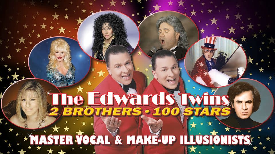 Two twins, 100 stars! Anthony and Eddie Edwards, Las Vegas' number one impersonators, use state-of-the-art makeup and their incredible talent to become legendary superstars like Sonny & Cher, Dolly Parton, Lady Gaga, Bette Midler, Barbara Streisand and many, many more.