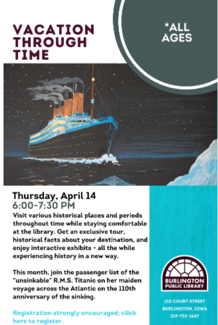 Experience history in a whole new way with this fun, family-friendly interactive program that lets you take a vacation - to the past! This month, sail aboard the RMS Titanic on her maiden voyage across the Atlantic. To register, click the picture or call 319-753-1647.