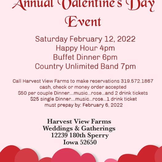 Bring your Valentine to the farm for a special evening, country style! $50 per couple ($25 single) includes happy hour with a free drink, buffet dinner, a rose for the ladies and an evening of live music with Country Unlimited. Call 319-572-1867 to reserve your spot. for more information, visit harvestviewfarms.com.