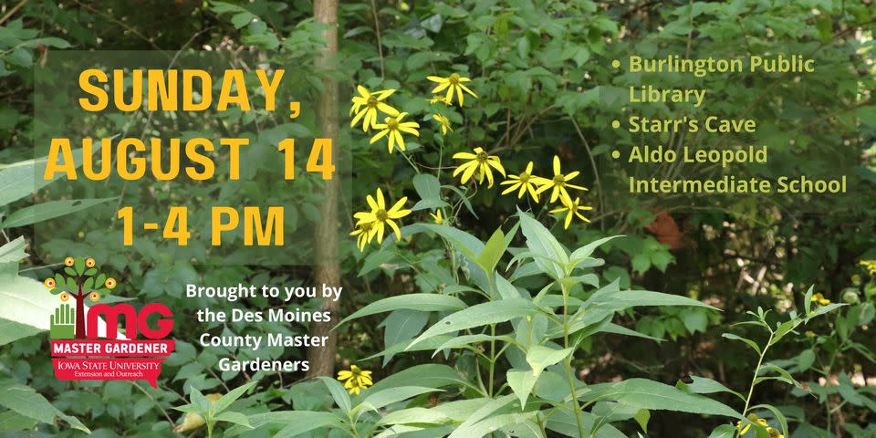 Participants can pick up a field guide at any of the three sites included - Starr’s Cave Nature Center, the Burlington Public Library, and the prairie “classroom” at Aldo Leopold Middle School - then visit each site to participate in a wildflower scavenger hunt. Master Gardeners will be on hand to answer questions.